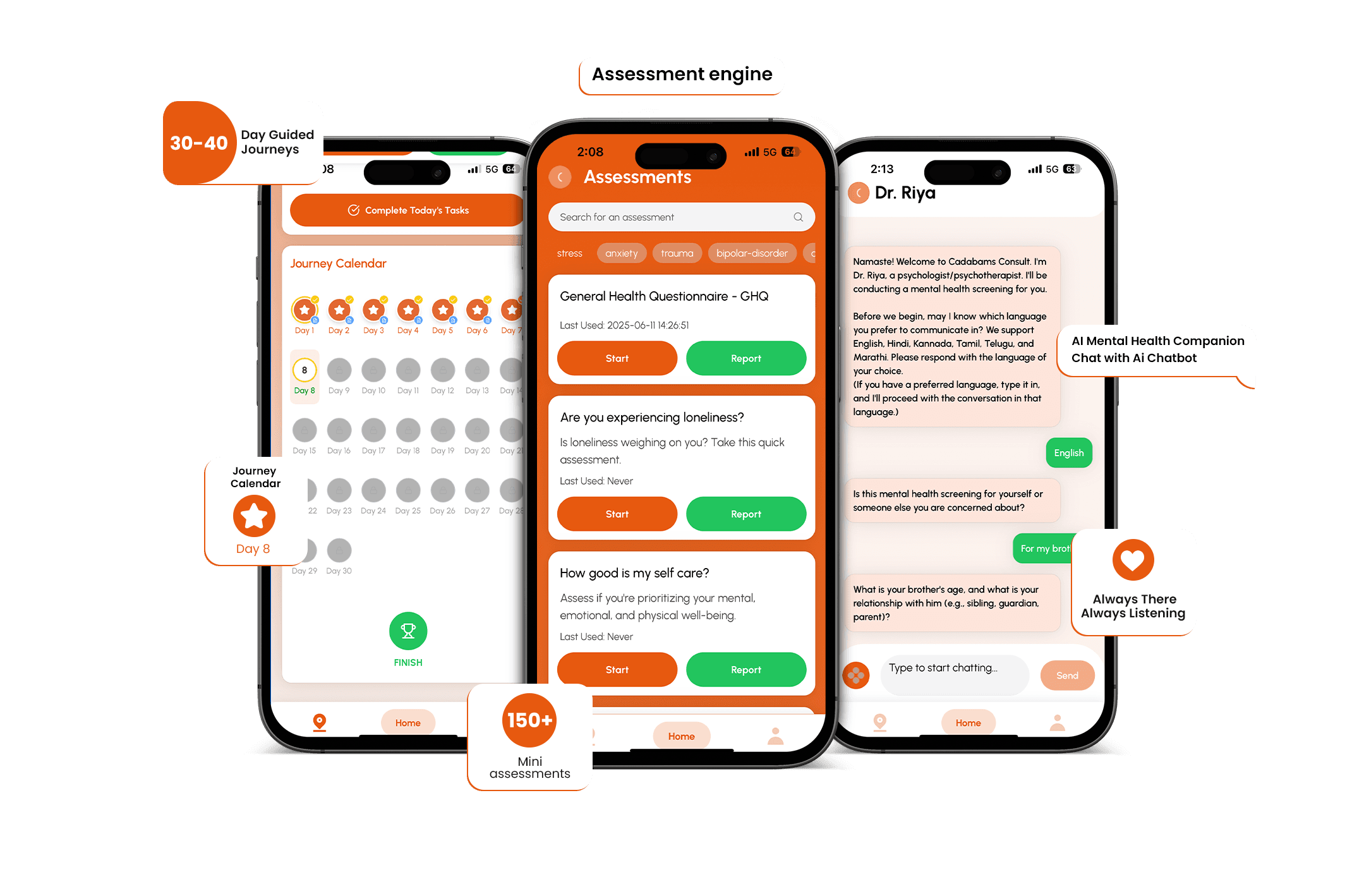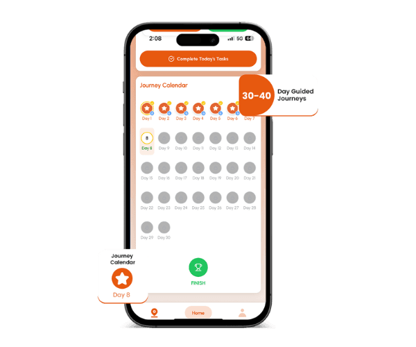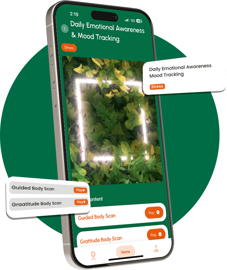 Small Steps, Big Shifts Our 30 day guided journeys are crafted by therapists to gently support users through stress, anxiety, low mood, and more. Each day offers a simple mix of micro-assessments, reflection prompts, and guided audio/video tools.30-Day Transformational Journey